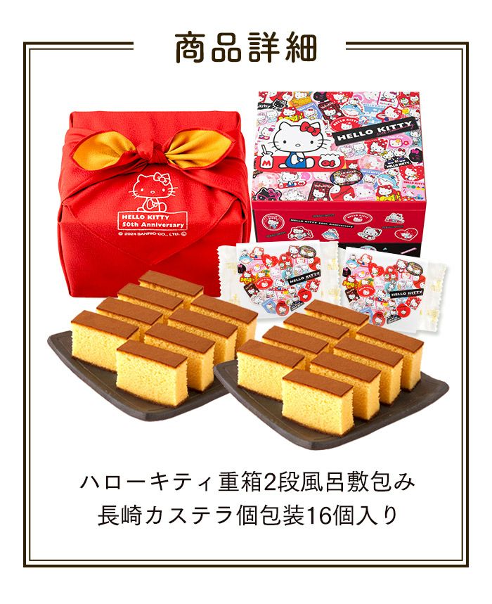 他の画像を見る 【在庫限りの販売となります】 ハローキティ 長崎カステラ 50周年 デザイン 2段重箱入り 風呂敷包み TK80 価格 ¥ 7,480 税込 5.00 (2) 販売期間 2025/06/16 10:00 〜 在庫切れ 詳細を見る お気に入りに登録する