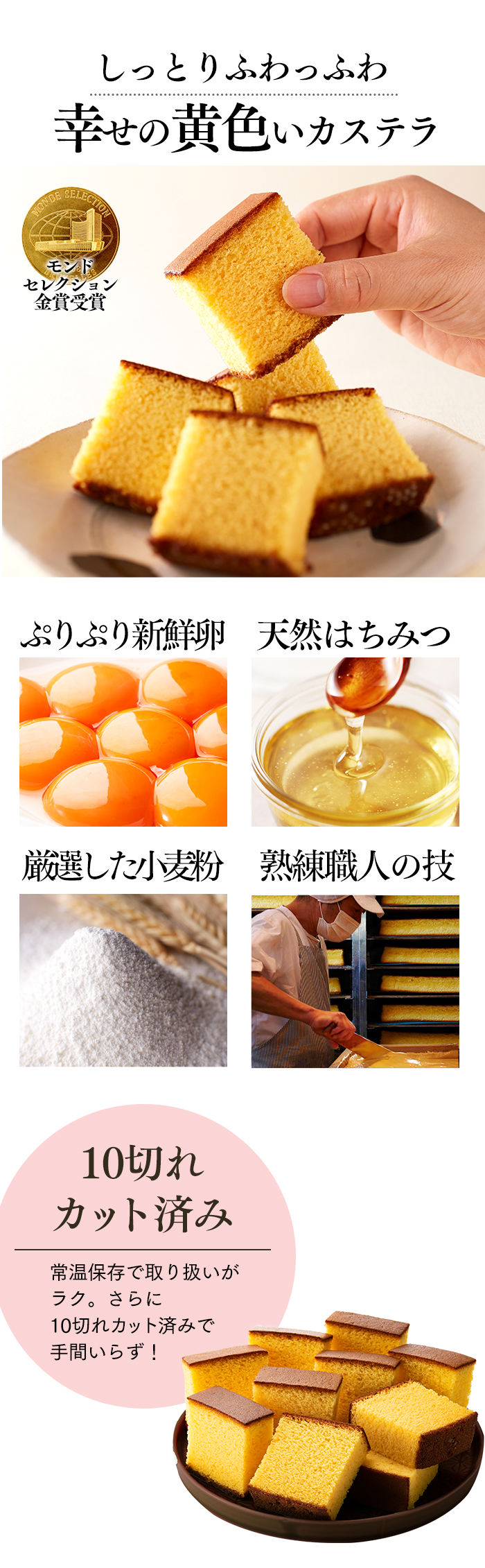 鶏卵(国産)、砂糖、小麦粉、水飴、ザラメ糖、蜂蜜、(一部に卵・小麦を含む)