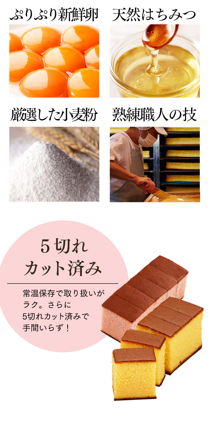 鶏卵(国産)、砂糖、小麦粉、水飴、ザラメ糖、蜂蜜、(一部に卵・小麦を含む)