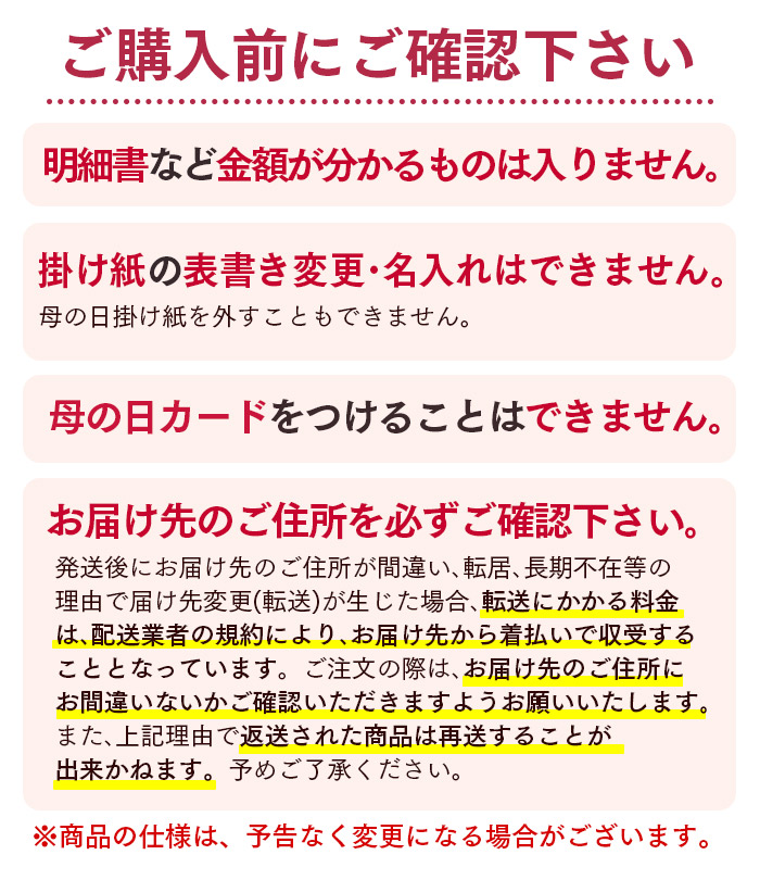 返品・交換につきましては、商品がナマモノのためお客様都合によるキャンセル・返品はご遠慮いただいております。(再送不可) 長期不在などで運送会社の保管期限切れで返送となった場合、お客様都合の返品扱い(ご請求対象)となります。