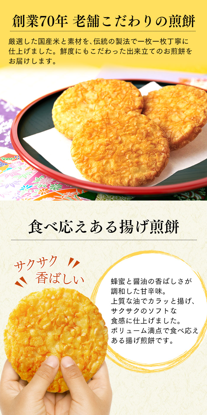 原材料 米菓生地(うるち米(国産)、澱粉)、植物油、砂糖、醤油、発酵調味液、液体調味料(アミノ酸液、水あめ、食塩、ぶどう糖)、ぶどう糖果糖液糖、蜂蜜、混合節エキス、食塩、カツオエキス調味料/調味料(アミノ酸等)、カラメル色素、(一部に小麦・さば・大豆を含む)