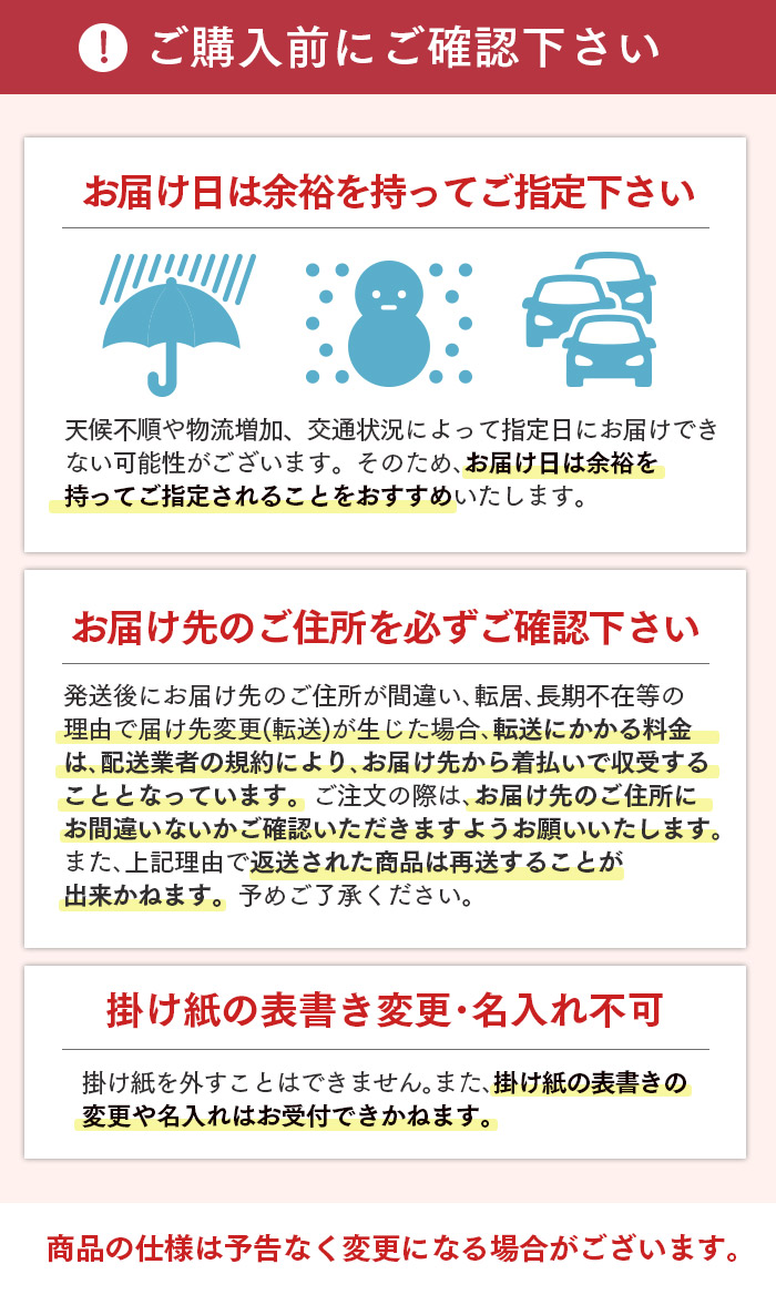 返品・交換につきましては、商品がナマモノのためお客様都合によるキャンセル・返品はご遠慮いただいております。(再送不可) 長期不在などで運送会社の保管期限切れで返送となった場合、お客様都合の返品扱い(ご請求対象)となります。