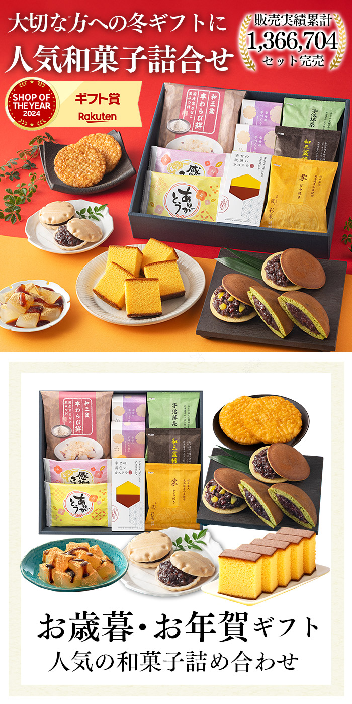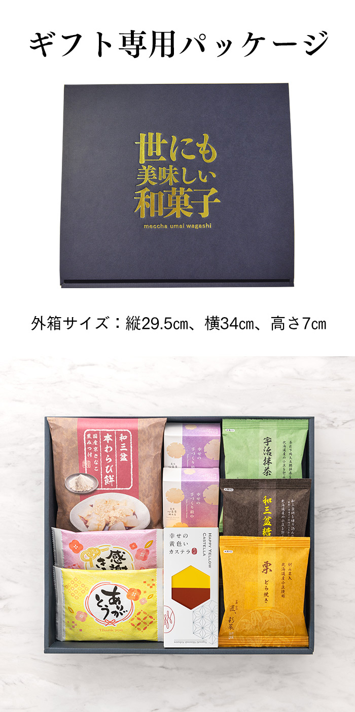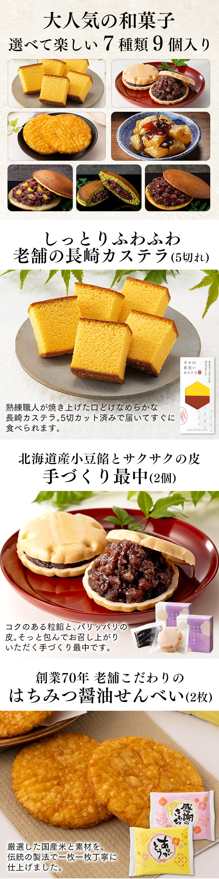 カステラ0.3号1本 最中2個 煎餅2袋 わらび餅1個 どら焼き3種各1個 |