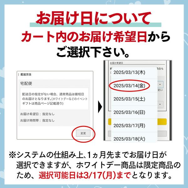 ご注文の混雑状況によって、多少前後する場合がございます。詳しくはお買い物ガイドをご確認ください。
